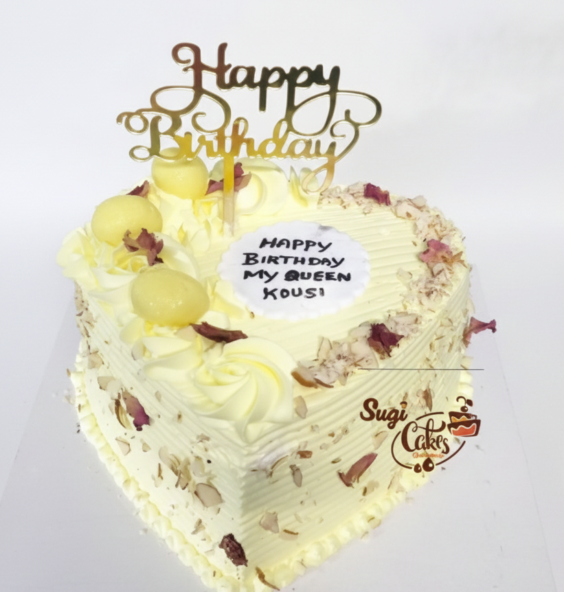 Heart‑shaped vanilla sponge layered with light whipped cream, golden truffle balls, and delicate rose flakes—perfect for anniversaries and romantic surprises.