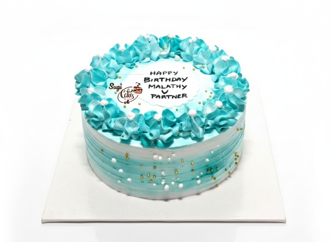 Moist vanilla sponge frosted in aqua blue cream and crowned with a ring of piped rosettes, giving a fresh ocean‑inspired look for any celebration