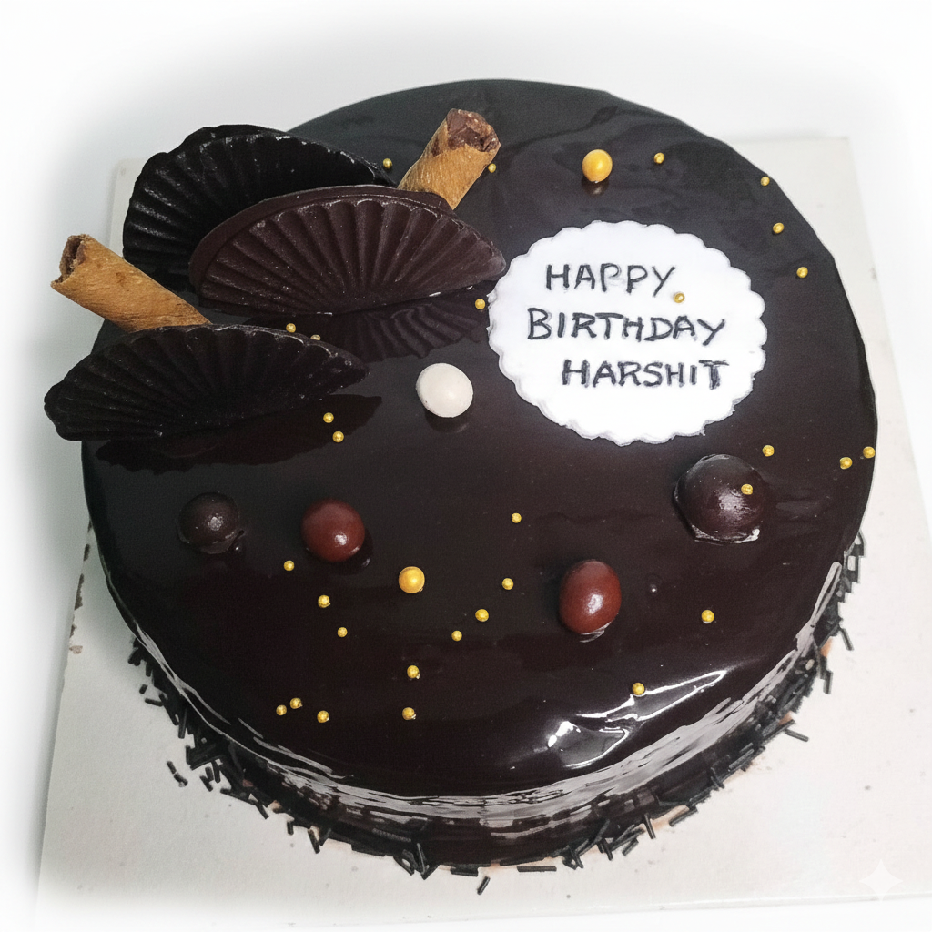 A rich chocolate sponge layered with dark chocolate cream, finished with a crunchy chocolate topping and bright floral accents—perfect for big family celebrations and office parties