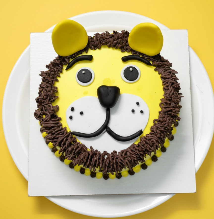Fun vanilla sponge cake decorated as a cute lion with creamy frosting and chocolate details, specially designed to delight kids on their special day.